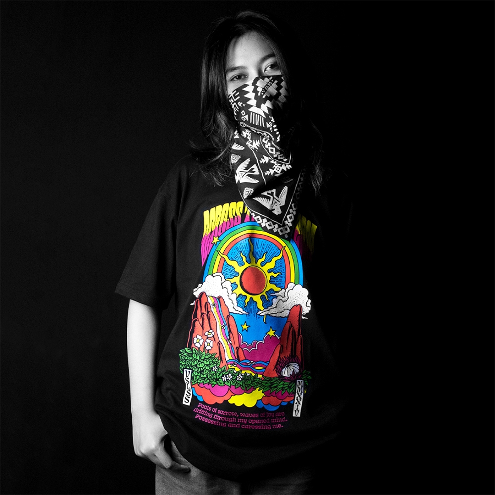Kaos Lengan Pendek VSLSS menggunakan bahan katun kombed 20s dan sablon plastisol pada bagian depan