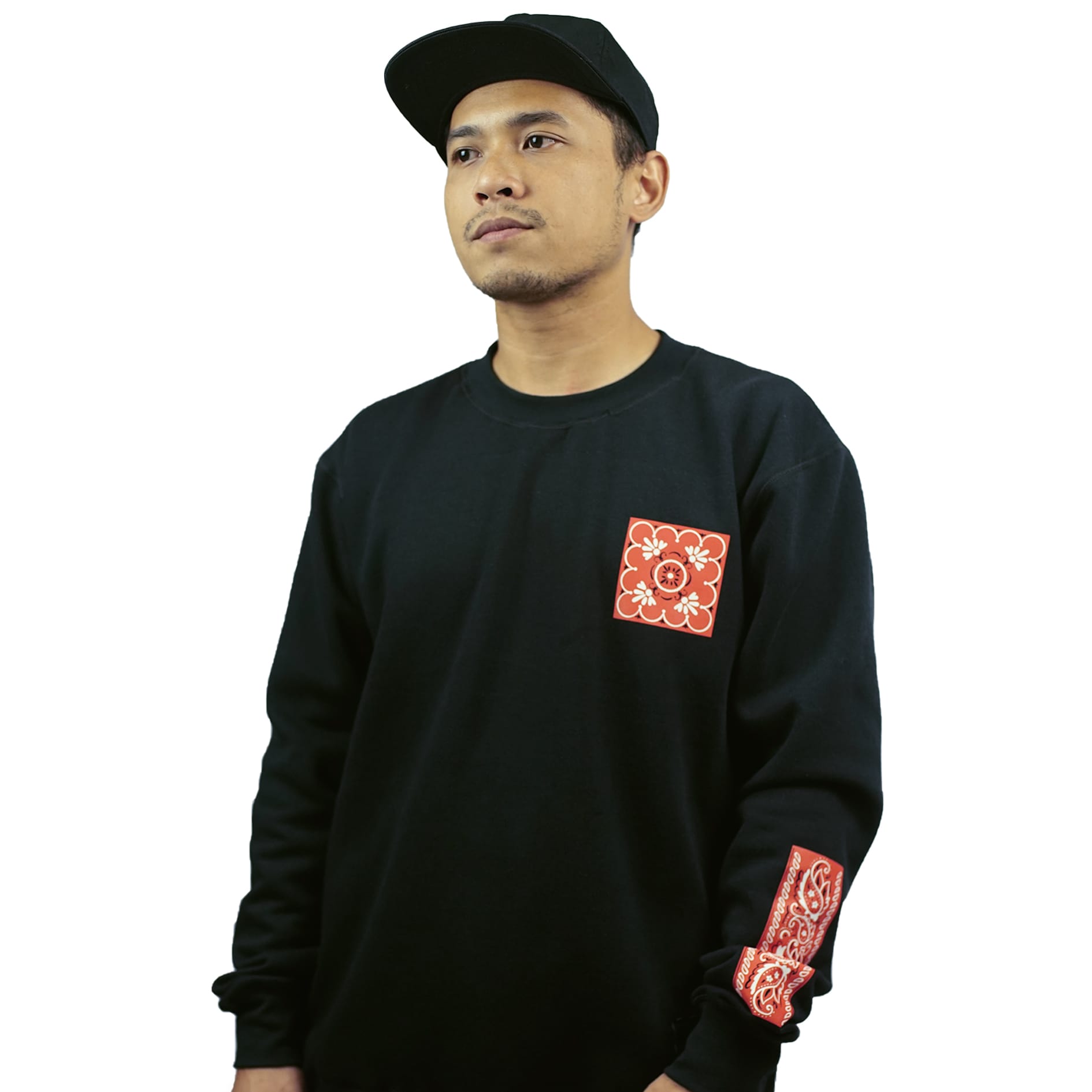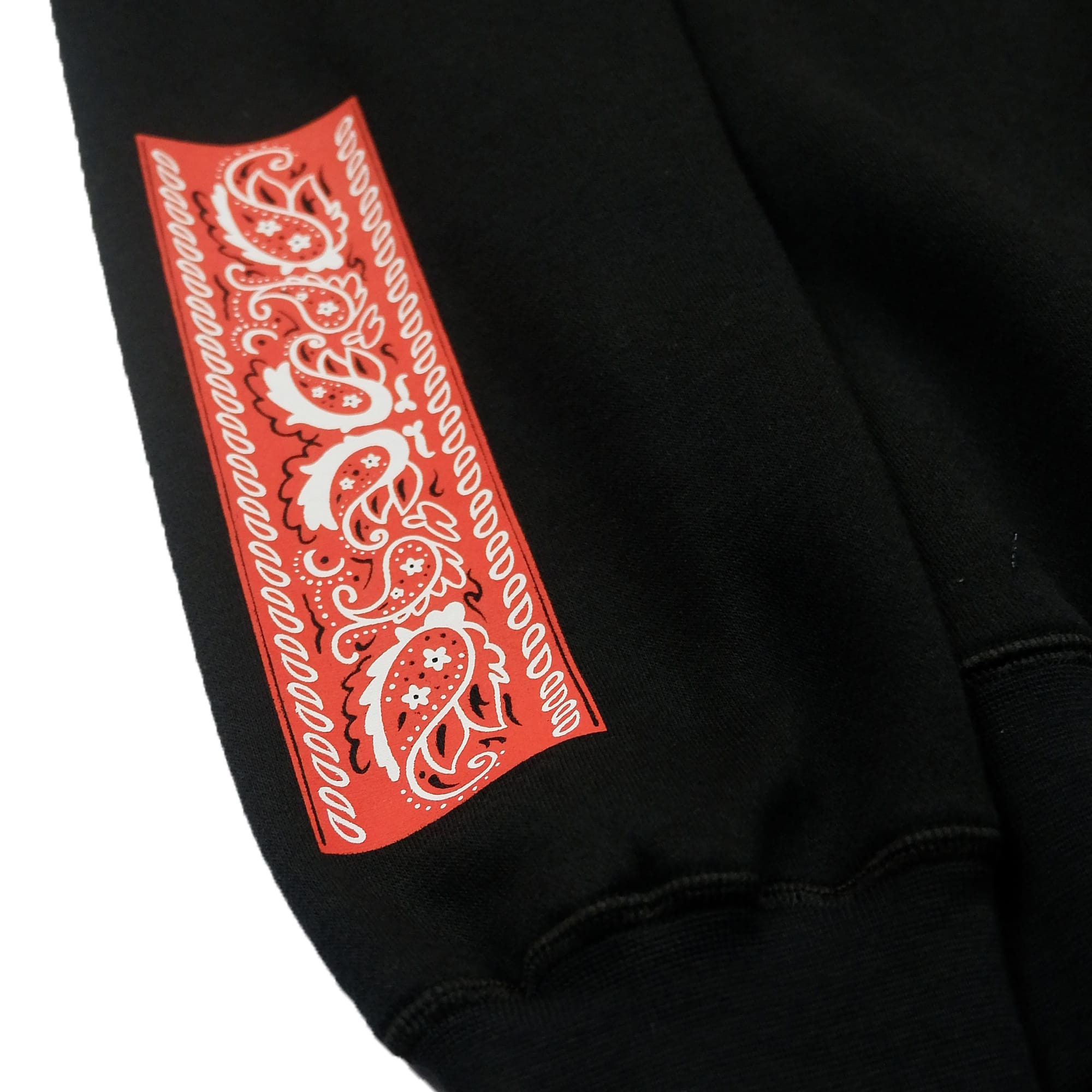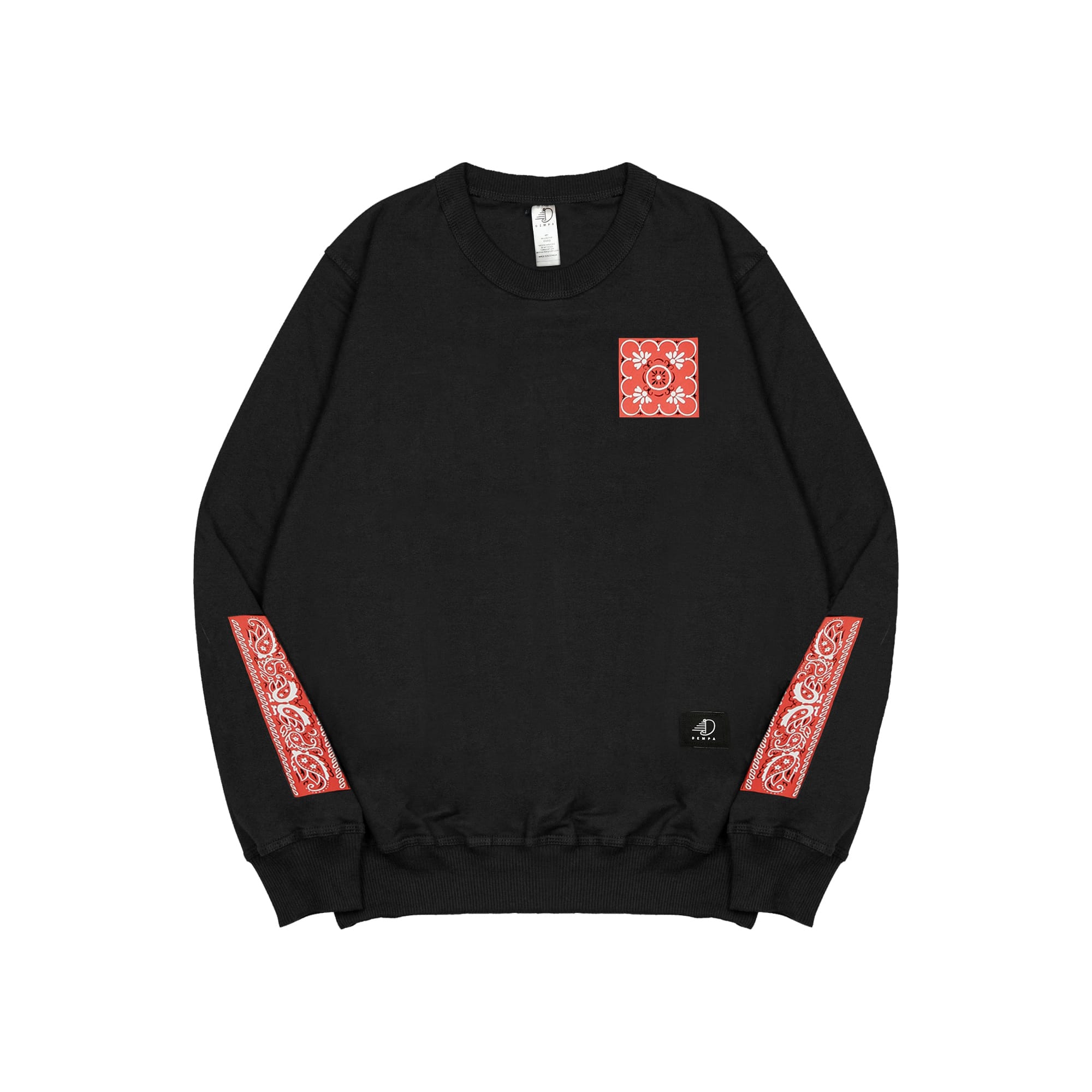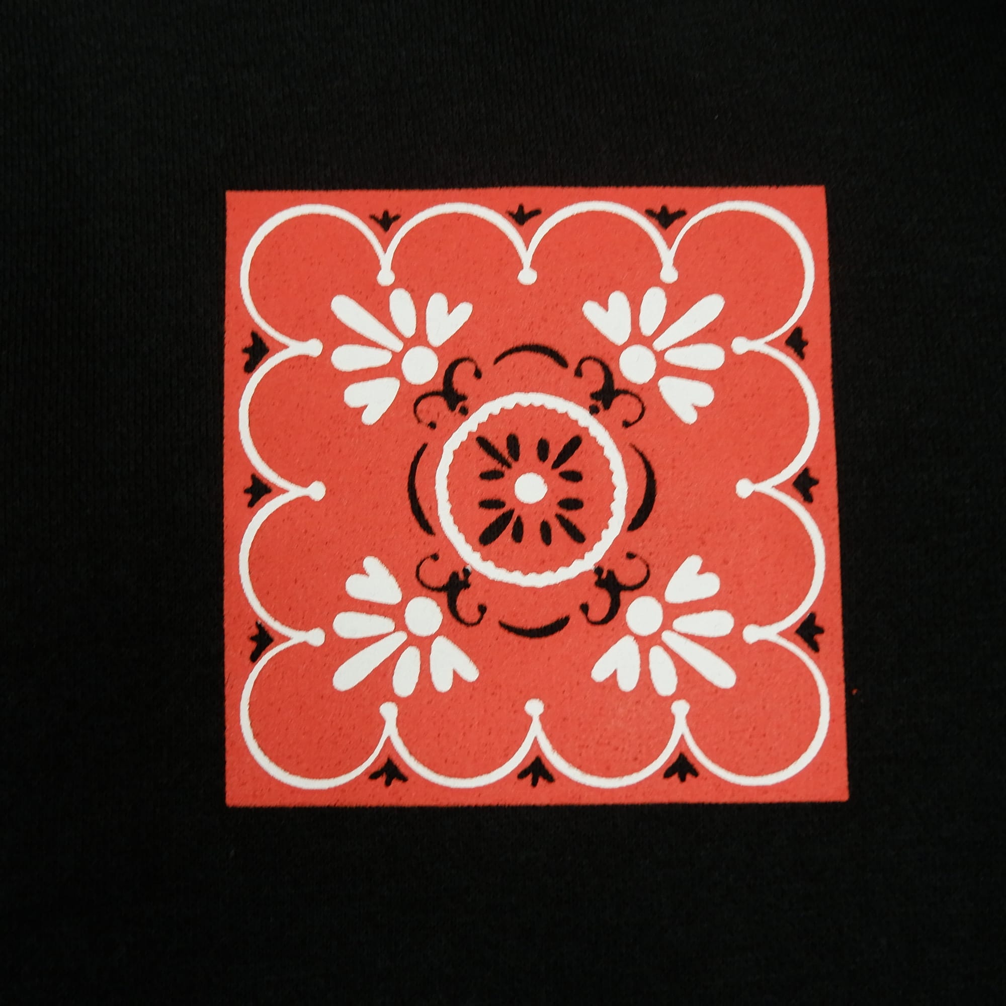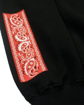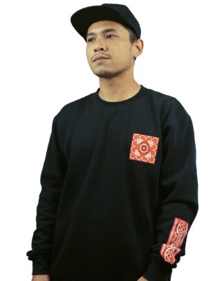 Black crewneck, with ink screen print at front and sleeve.