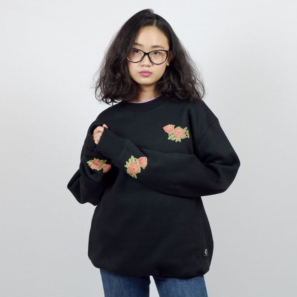 Black crewneck, with ink screen print at front and sleeve.
