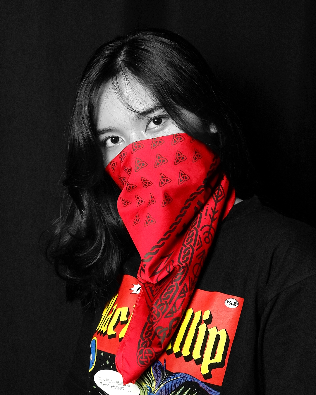 VSLSS bandana/scarf using sogo material measuring 55 cm x 55 cm and screen printing on the front