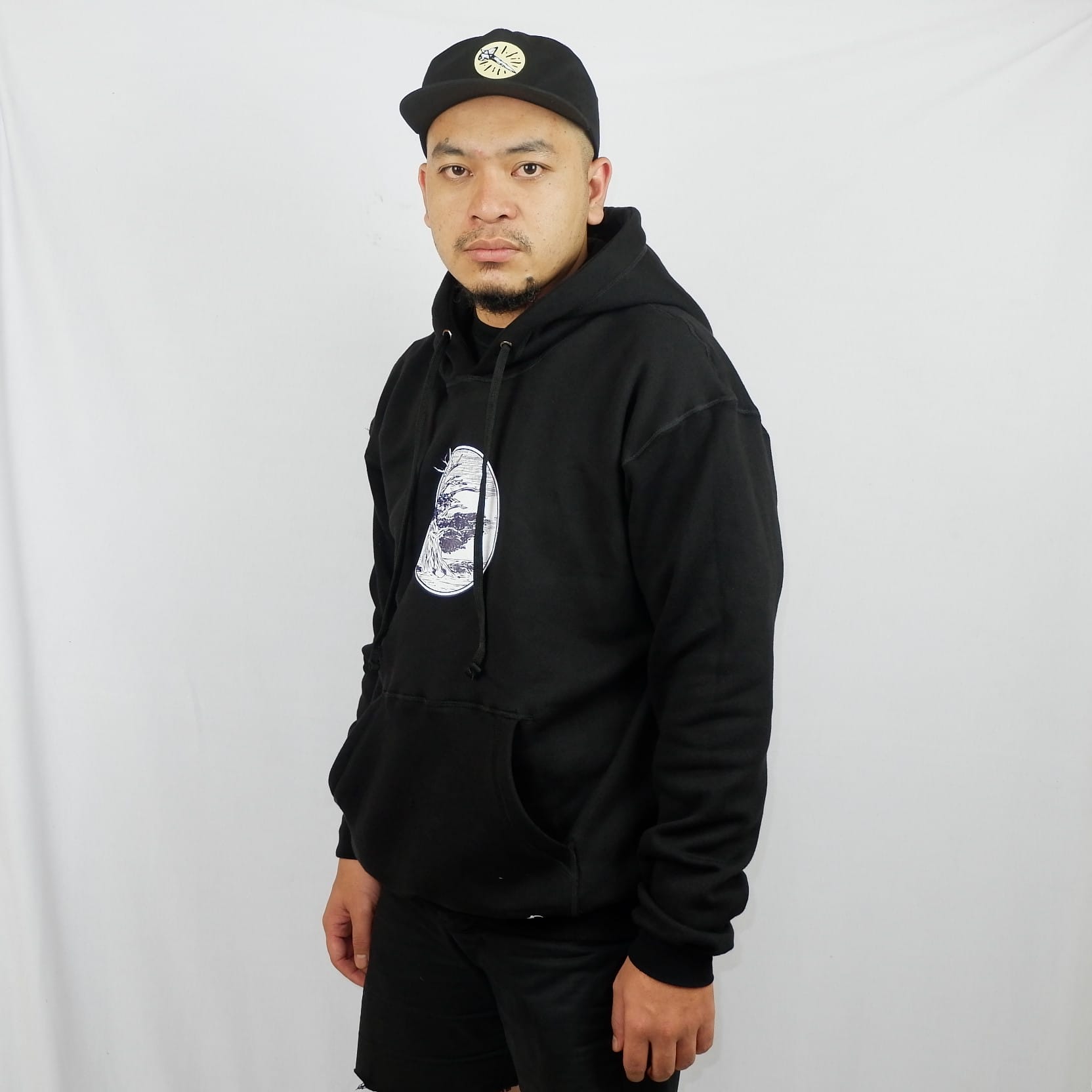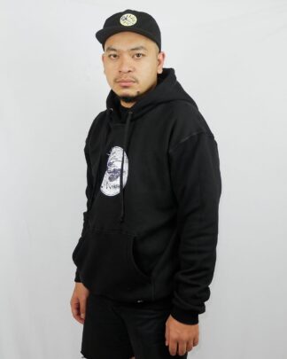 Pullover hoodie, with ink screen print at front.