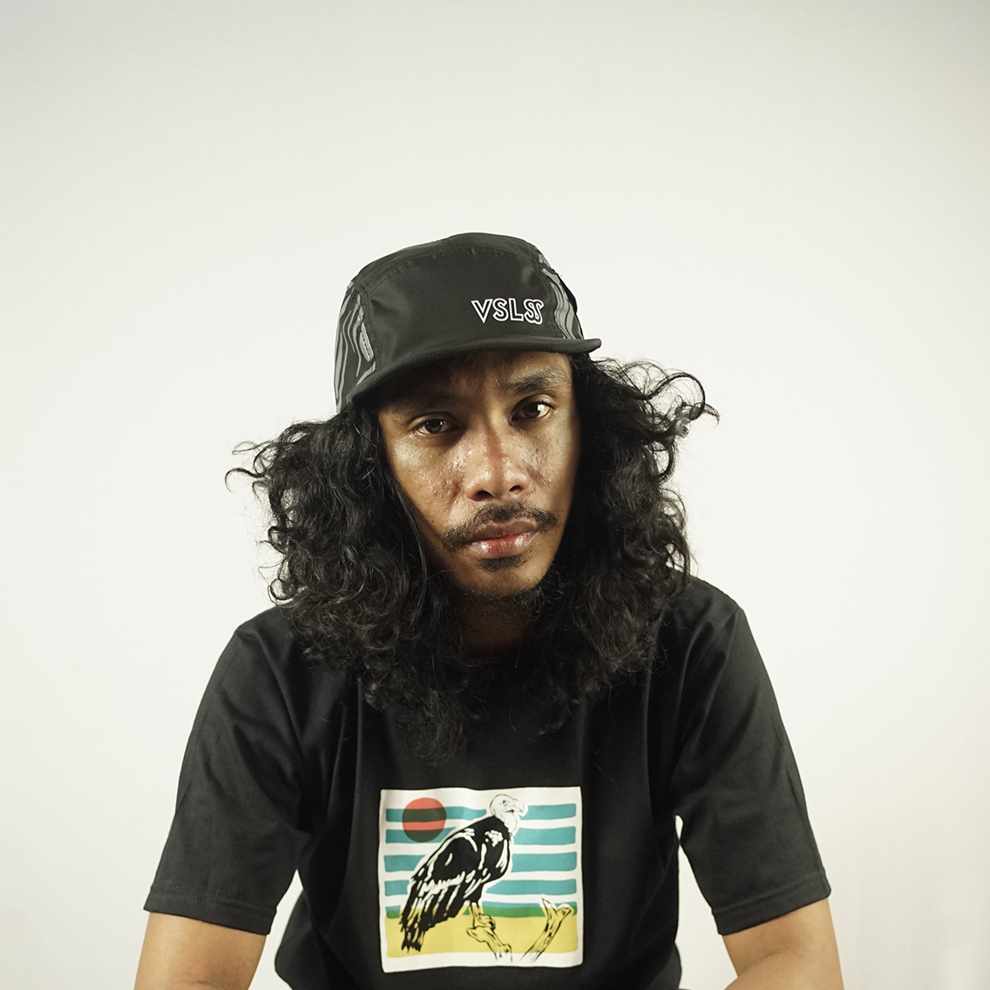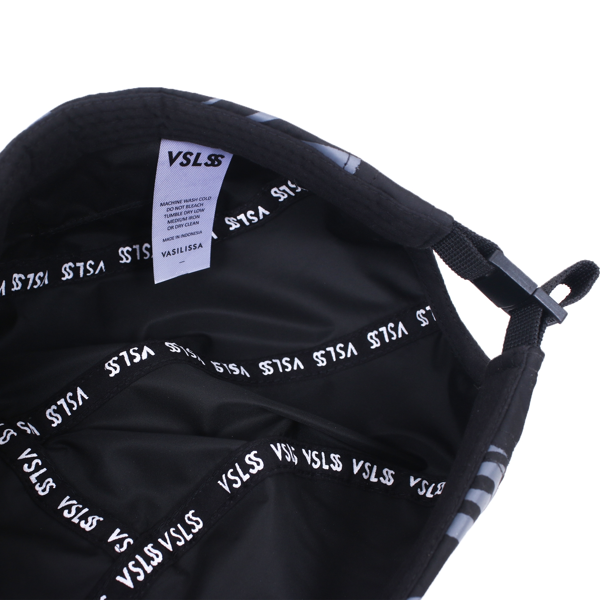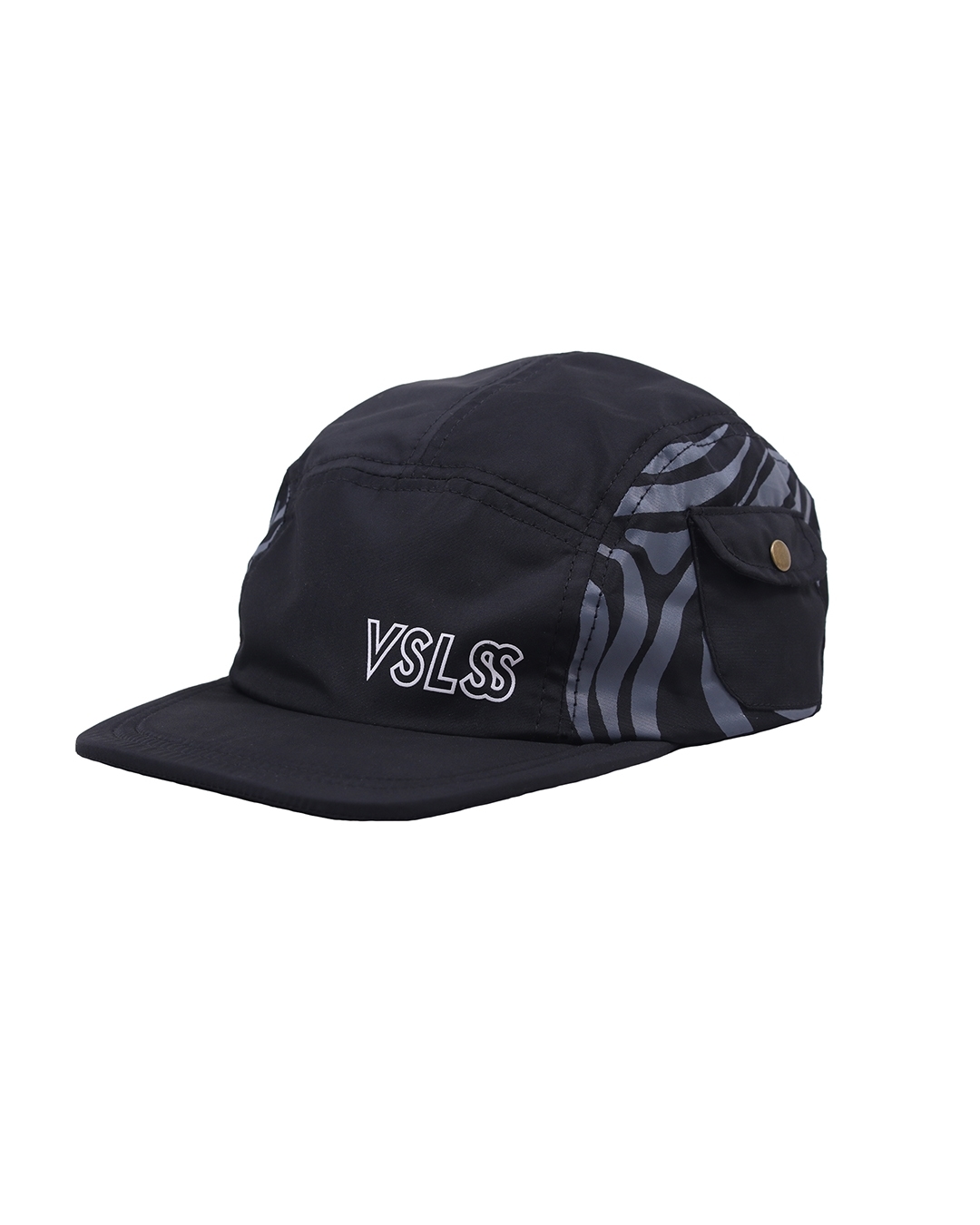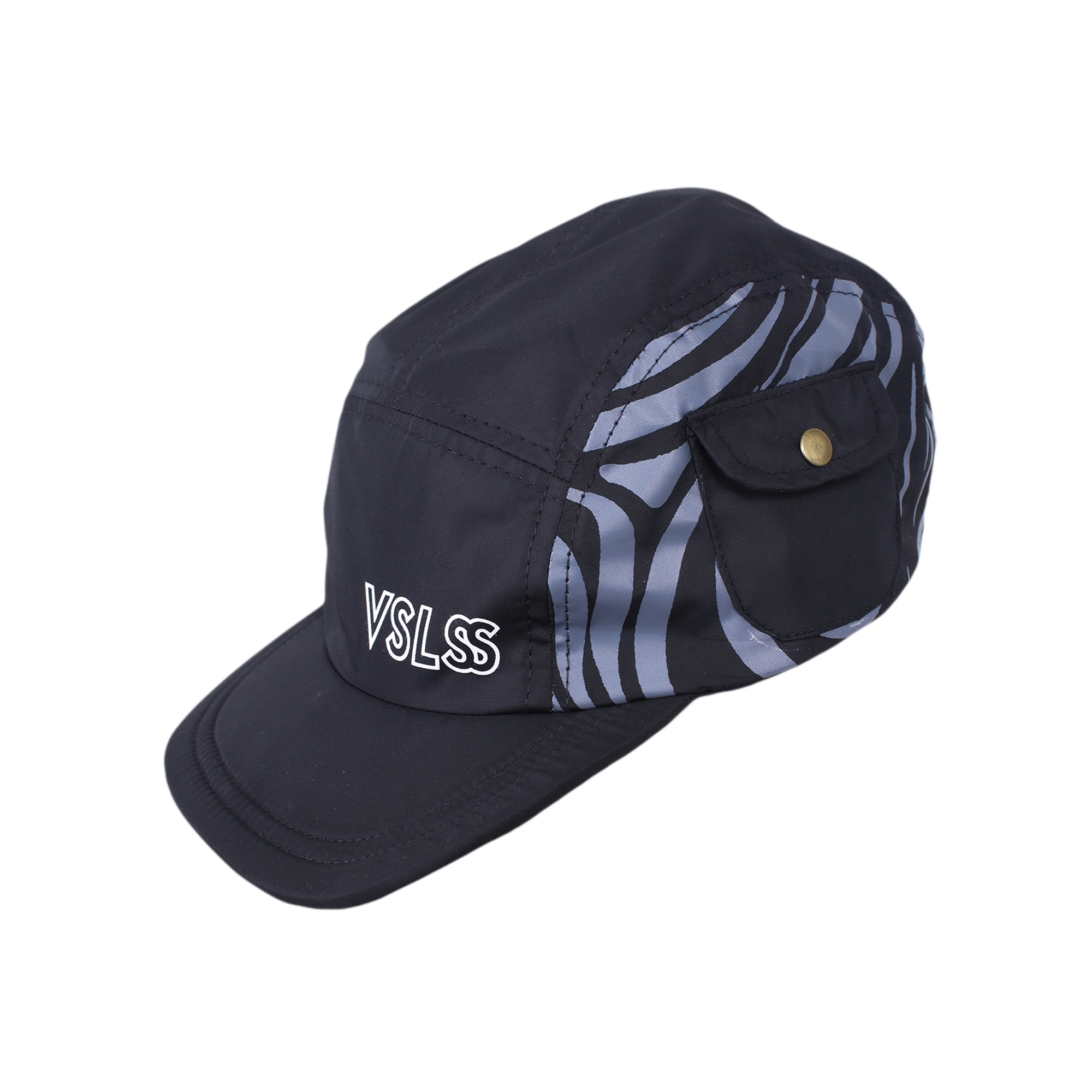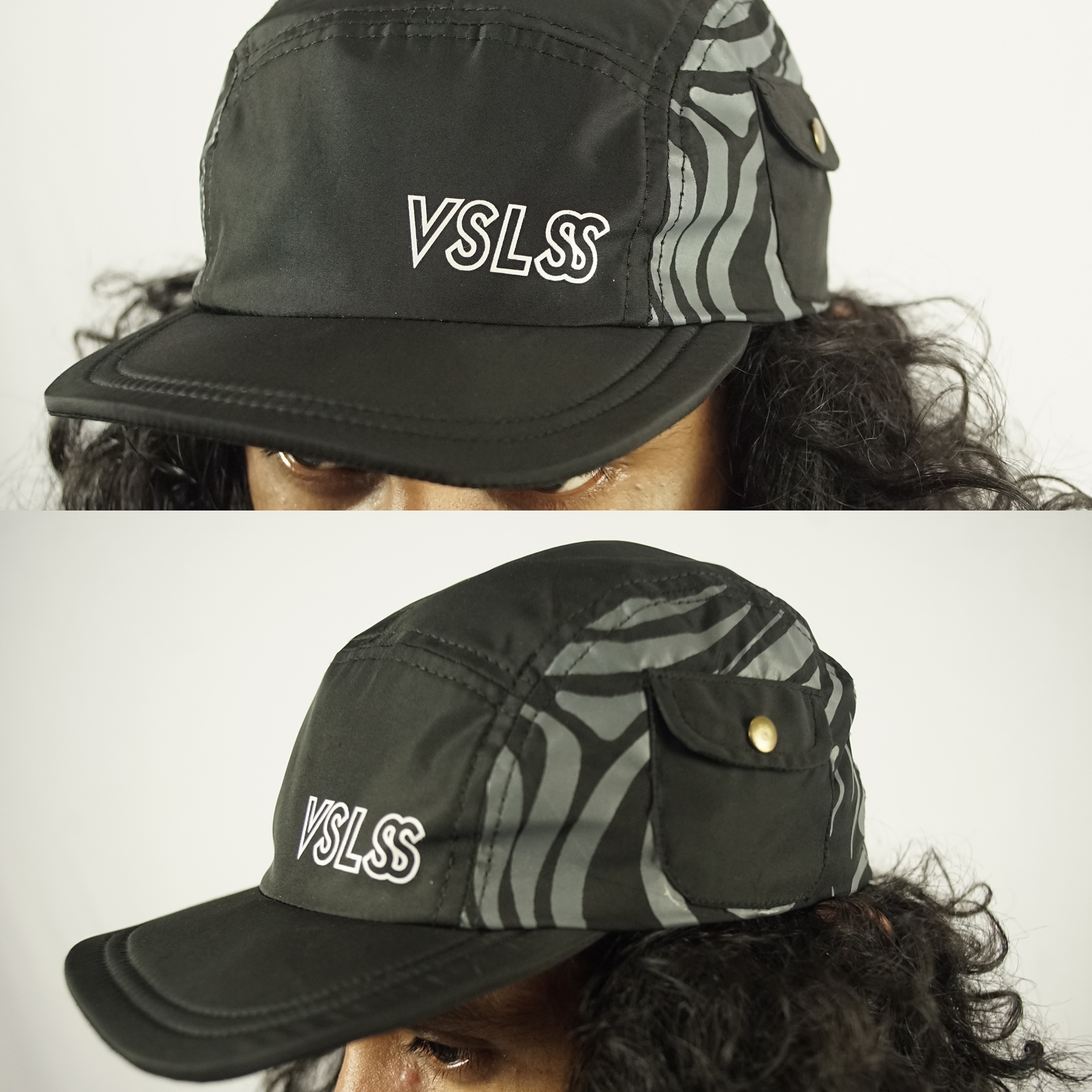 Topi 5panel hitam VSLSS dengan sablon di bagian depan dan samping