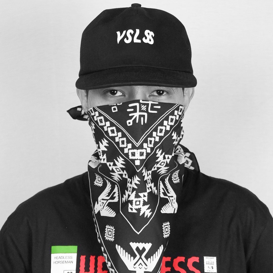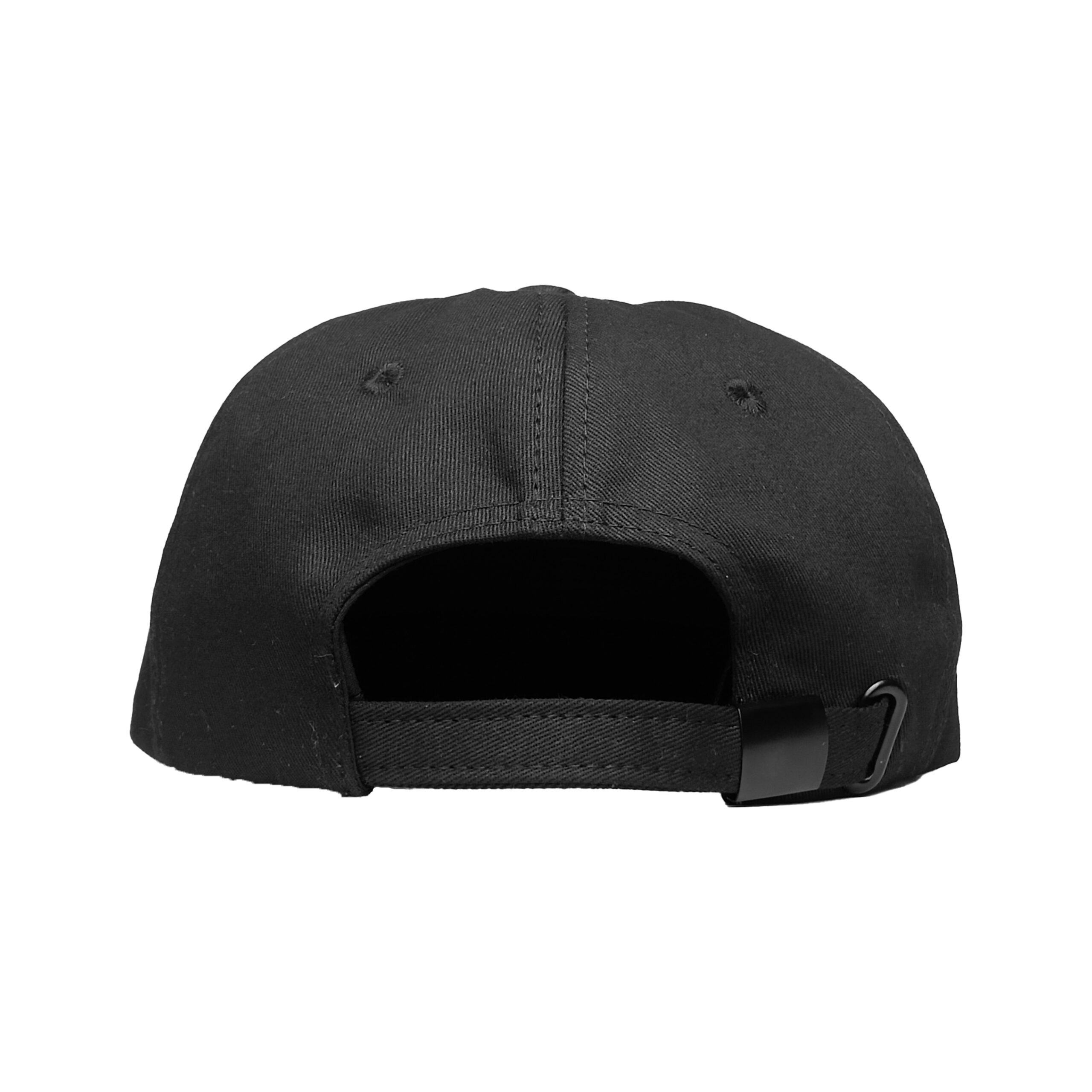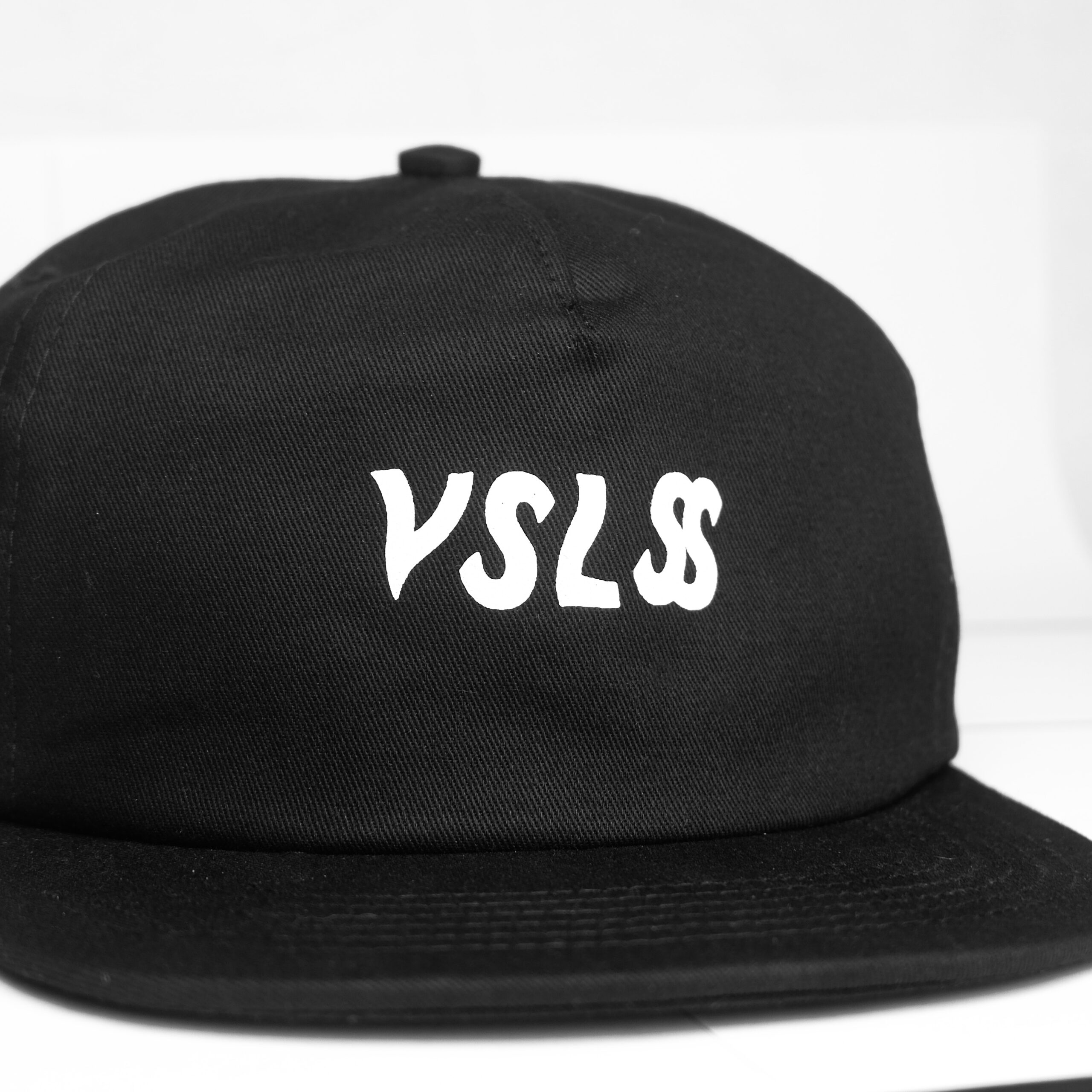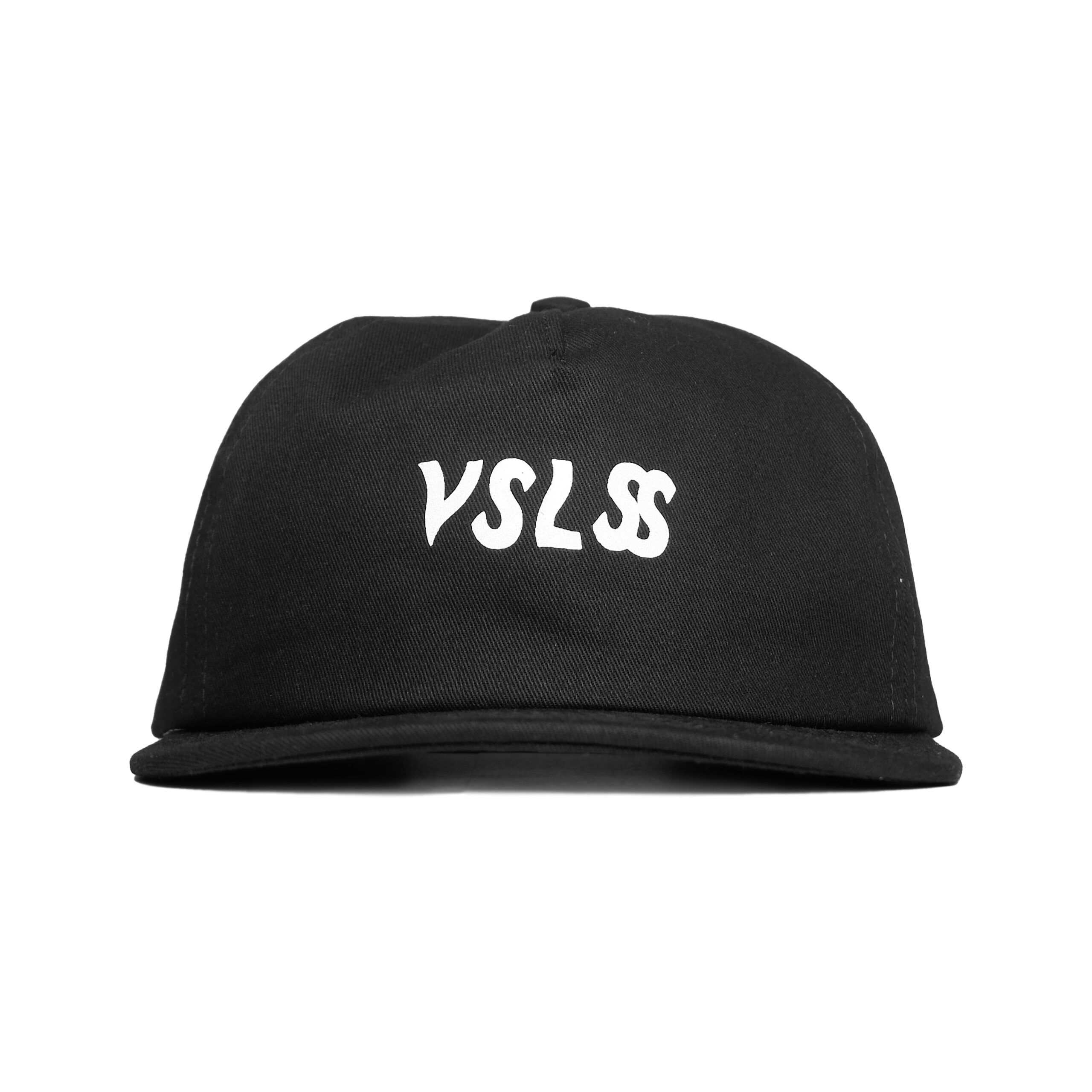 VSLSS black unstructured strapback hat with screen printing on front