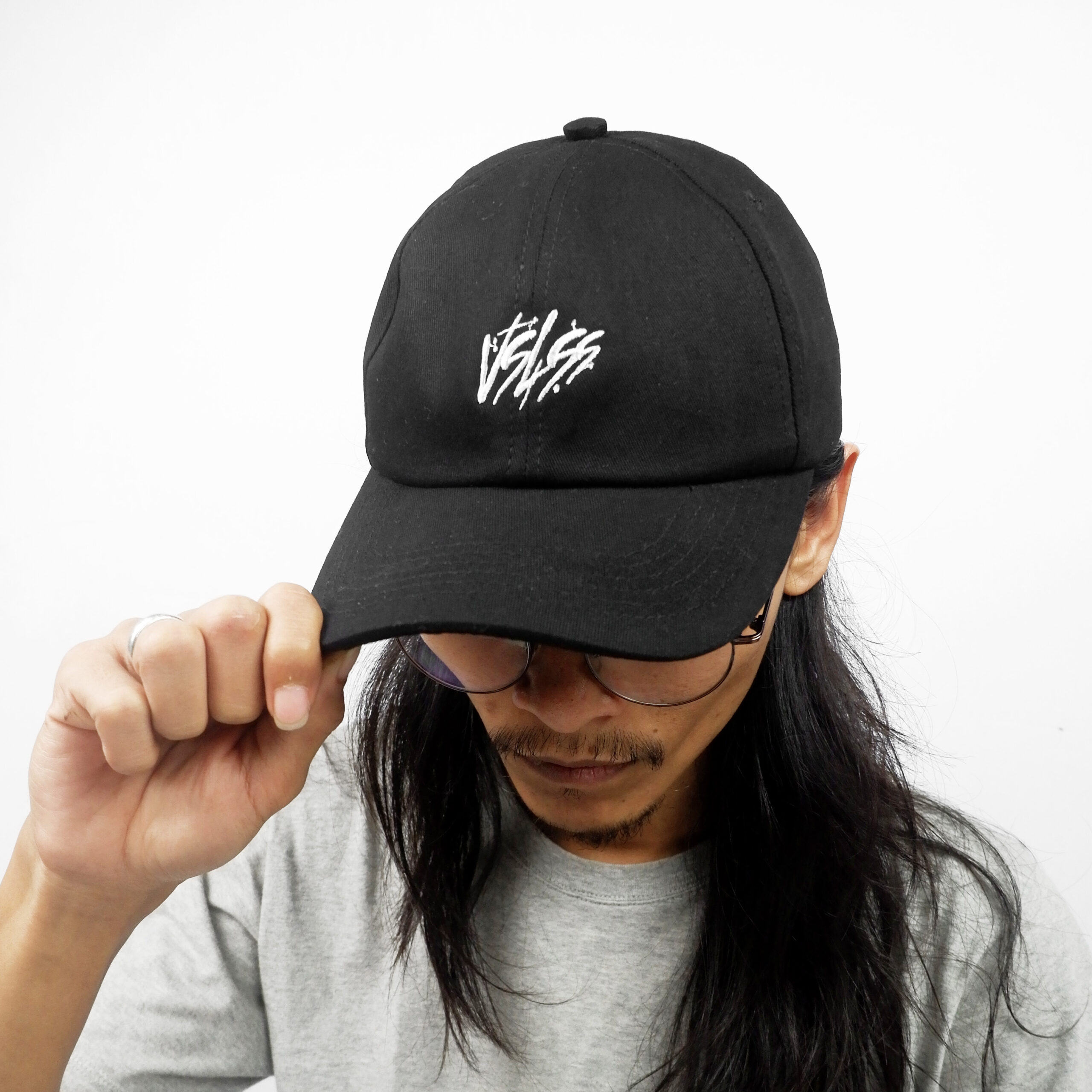 Topi hitam VSLSS dengan bordiran di bagian depan