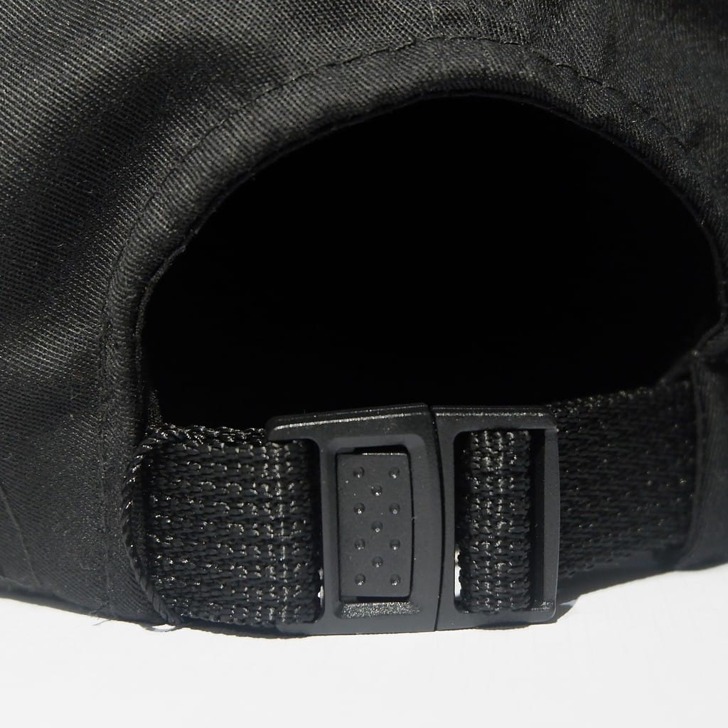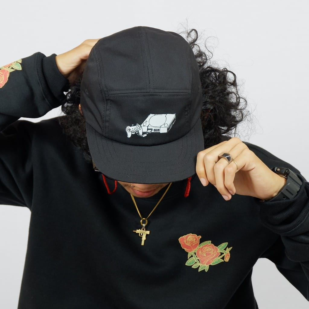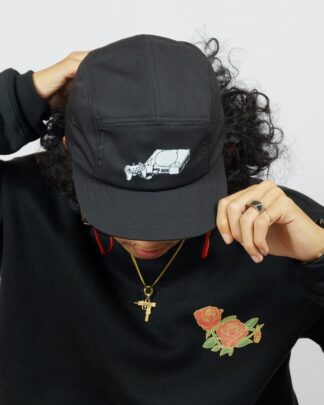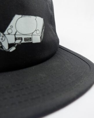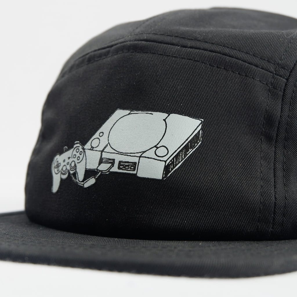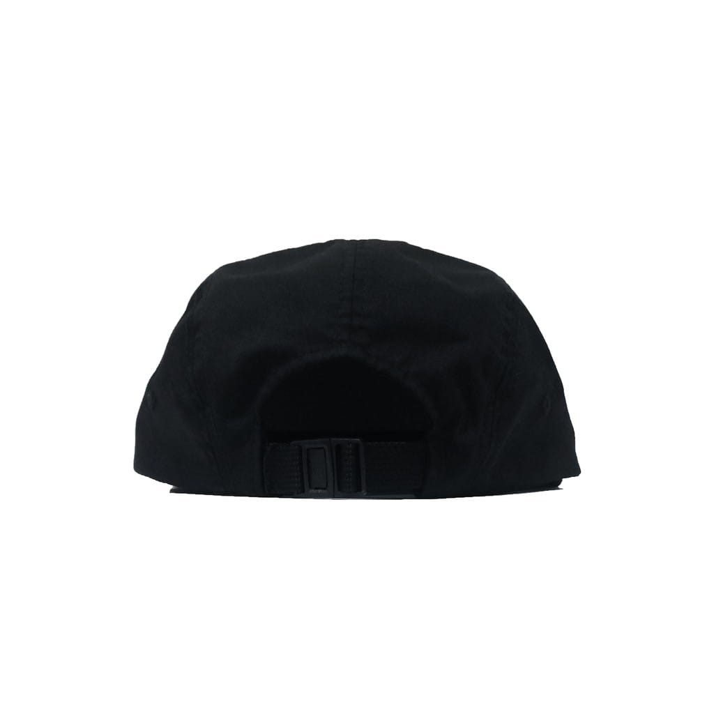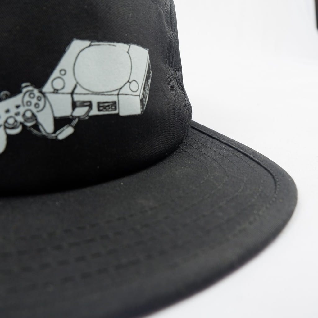 Black 5 panel caps with ink screen print at front