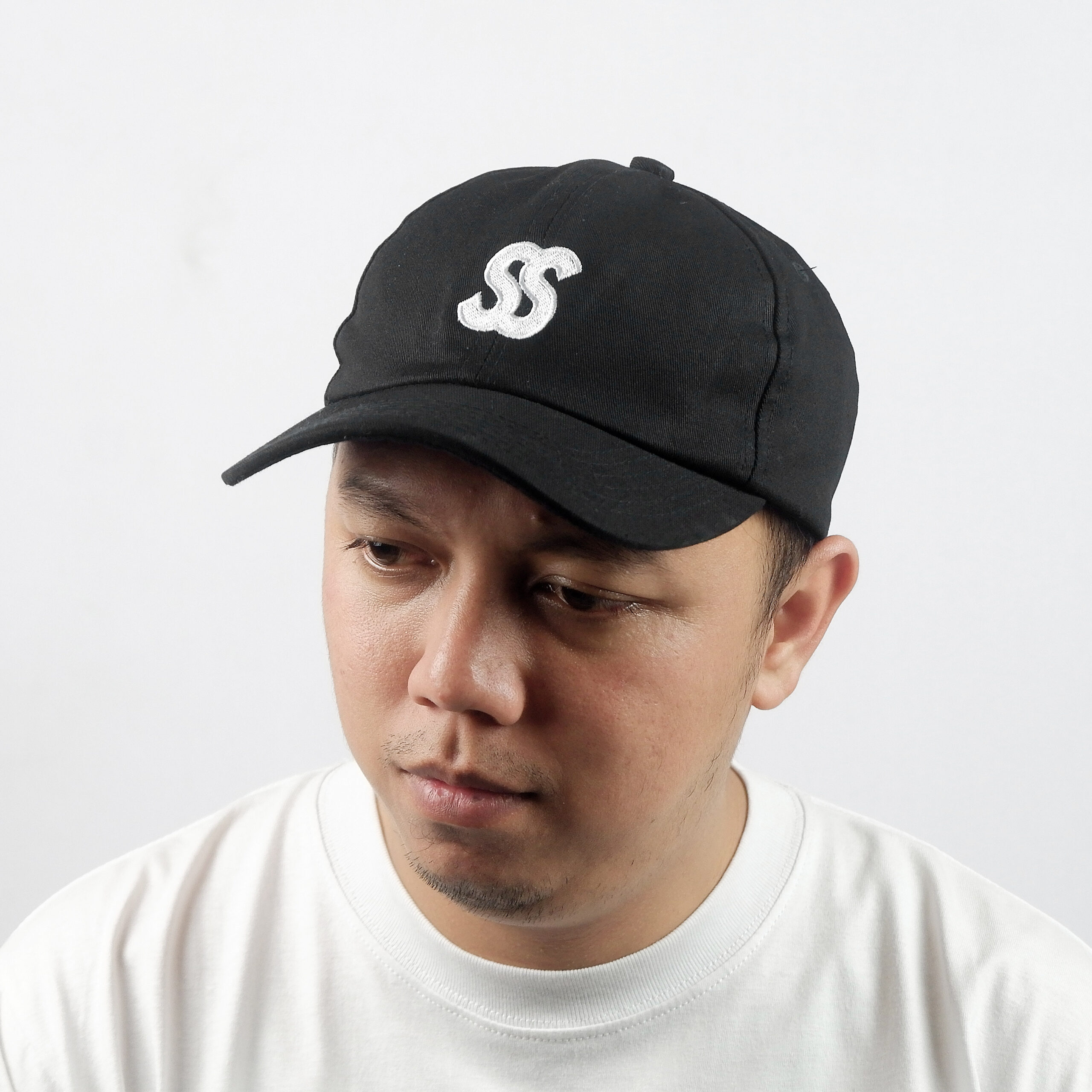 Topi hitam VSLSS dengan bordiran di bagian depan